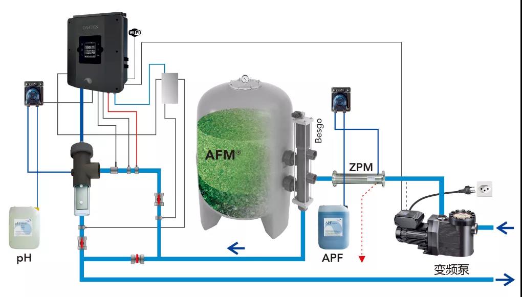因此,為了保障游泳者的身體健康,必須采取更科學專業的消毒方式進行泳池消毒,戴思樂逐夢深藍低氯系統就能很好的解決余氯不達標的問題,低氯系統運用水流動力學、通過正確的循環過濾和反沖洗設計,從根本上解決了影響水質的主要因素,從而減少了對消毒藥劑的依賴,避免余氯超標的問題出現。此外,低氯系統還結合了一種自凈化AFM活性濾料,對水質進行無污染凈化,而且AFM濾料表面具有自我消毒功能,能對池水進行有效消毒,抑制細菌的生長。