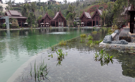 就以萬達西雙版納國際度假區來說,承擔了其酒店群的主樓前場、SPA區的兩個人工景觀湖水處理的改造項目,水面面積約8000m2、水量30000m3,處理后的水質達到地表水Ⅲ類標準,整個方案采用了“生態治理法+機械曝氣”的水處理工藝。