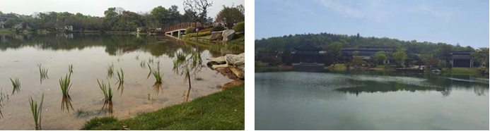 改造前,湖面水體程淡綠色,主要是由于有機物、氮、磷過多,從而引起水中藻類及浮游生物迅速繁殖;改造后,人工湖經改造后再次恢復了清亮,水質清澈見底,一眼望下去,清晰可見湖水底部形態各異的鵝卵石。