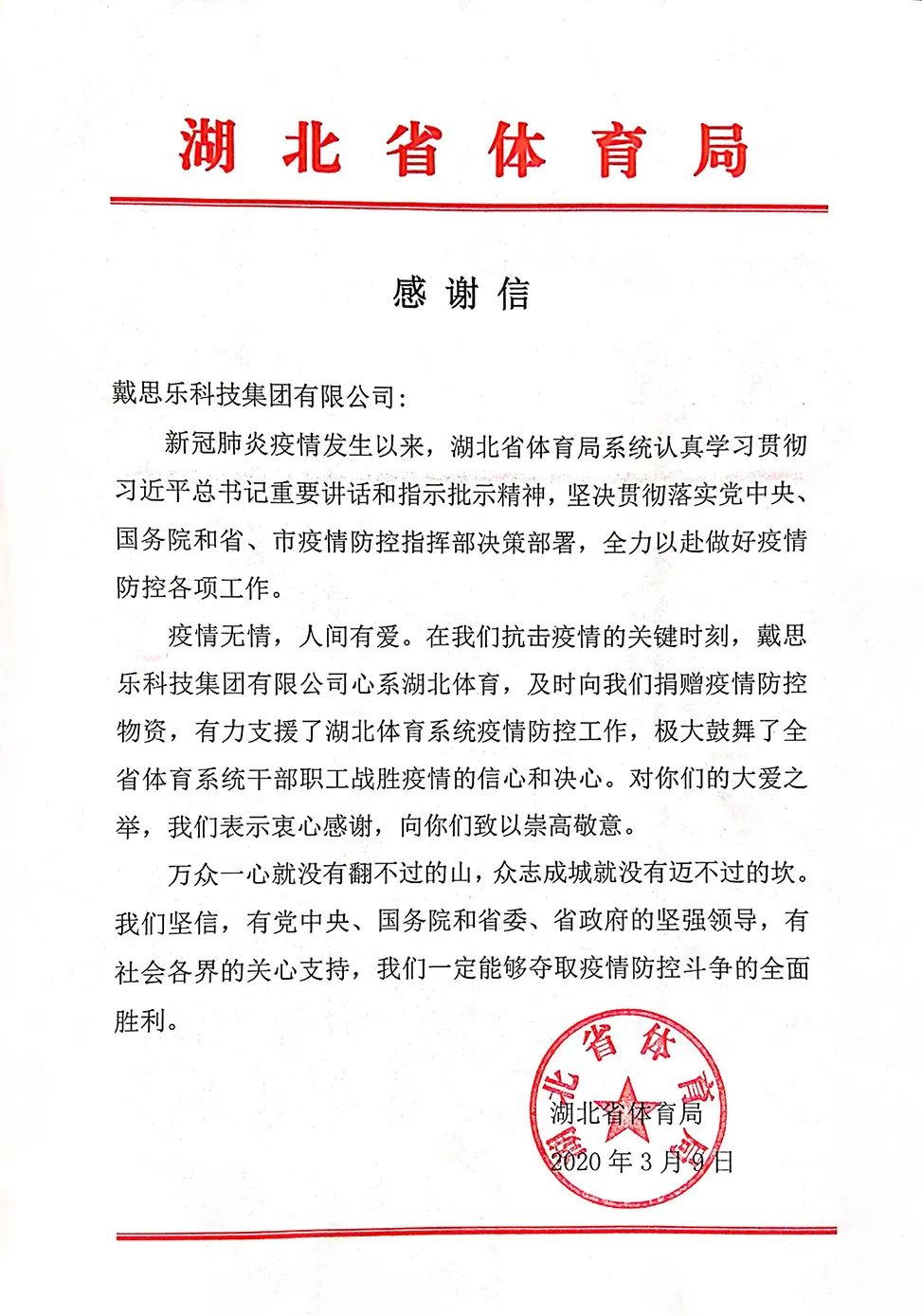 同時,戴思樂集團收到了湖北省體育局發(fā)來的感謝信。