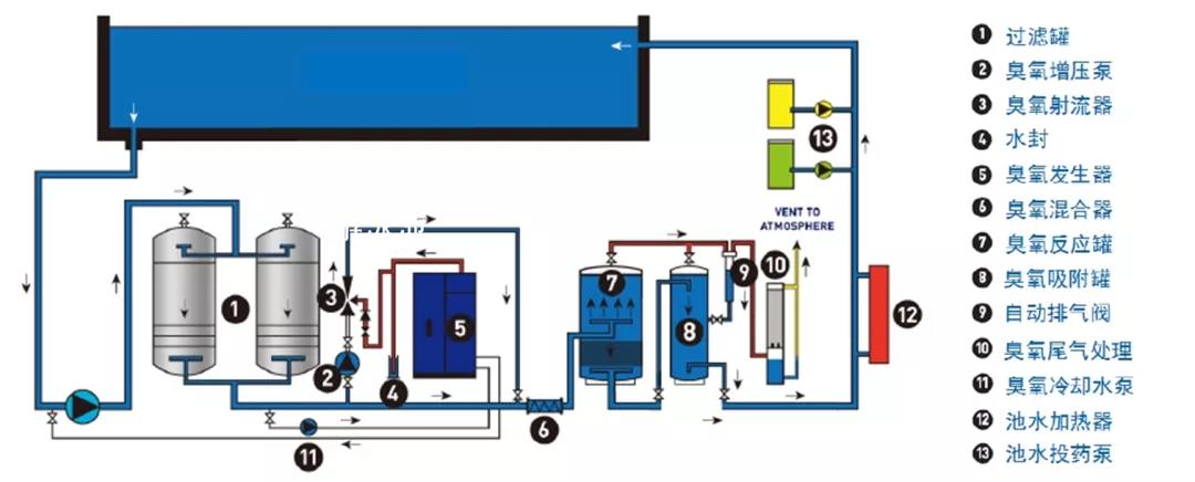 為了減少投氯,解決“砂”作為濾料時過濾精度不夠、導致大量細菌繁殖的問題,需采用“臭氧消毒”,利用臭氧的強氧能力進行殺菌,同時利用臭氧的絮凝作用,讓水質更清澈。